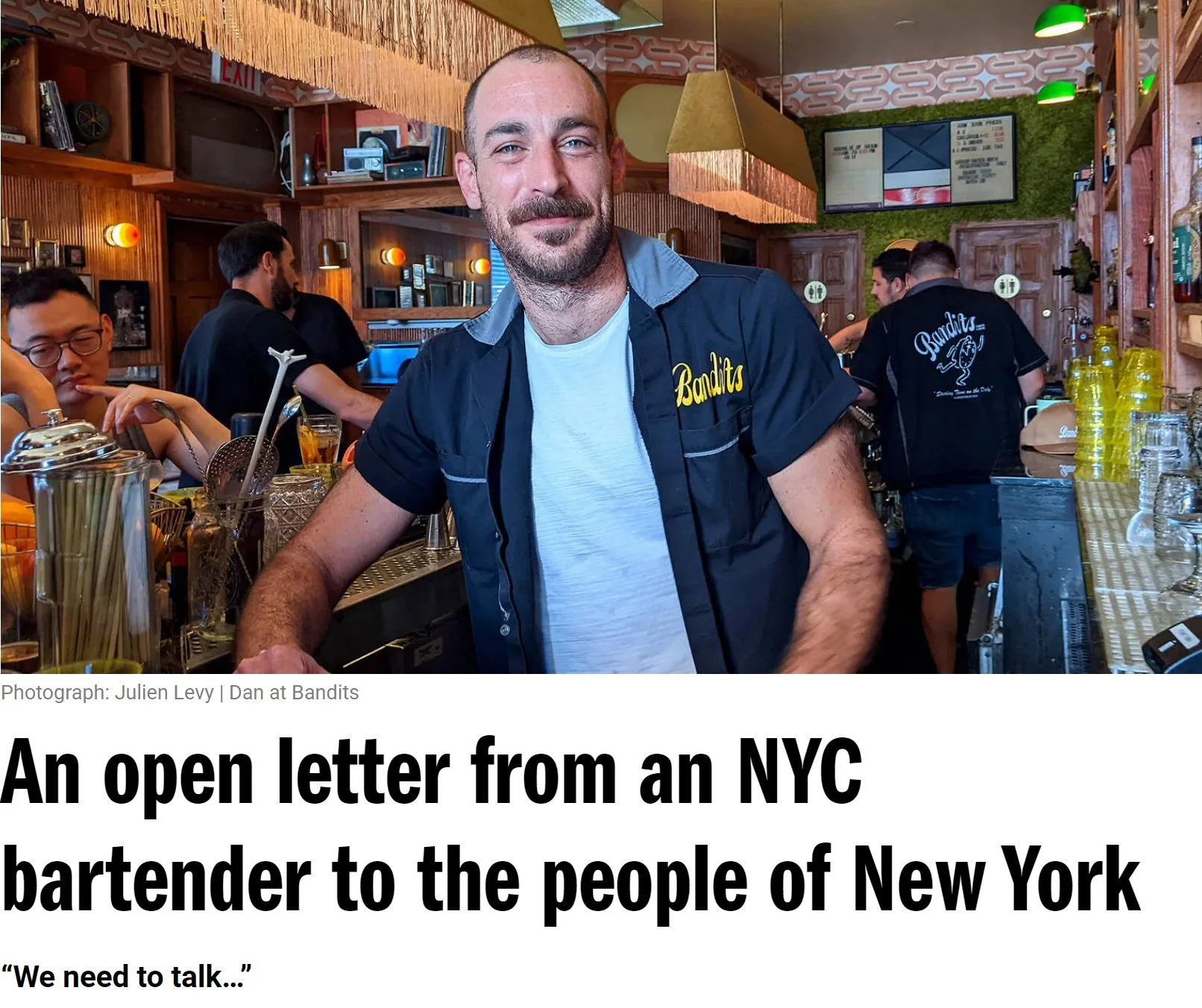 “‘If you were a dick before COVID to bartenders, you’re probably a dick again.’ [says bartender, George, noting] the grim reemergence of finger-snapping and hand-waving for attention. [As barenders, our] job is to give you what you want, but we’re not obliged to sacrifice our dignity or safety or judgment. We aim to accommodate you, but that’s at our discretion. Kind words are nice, but compliments don’t pay the rent. We’re here to serve, but we’re nobody’s servant. Don’t agree? There’s the door.”