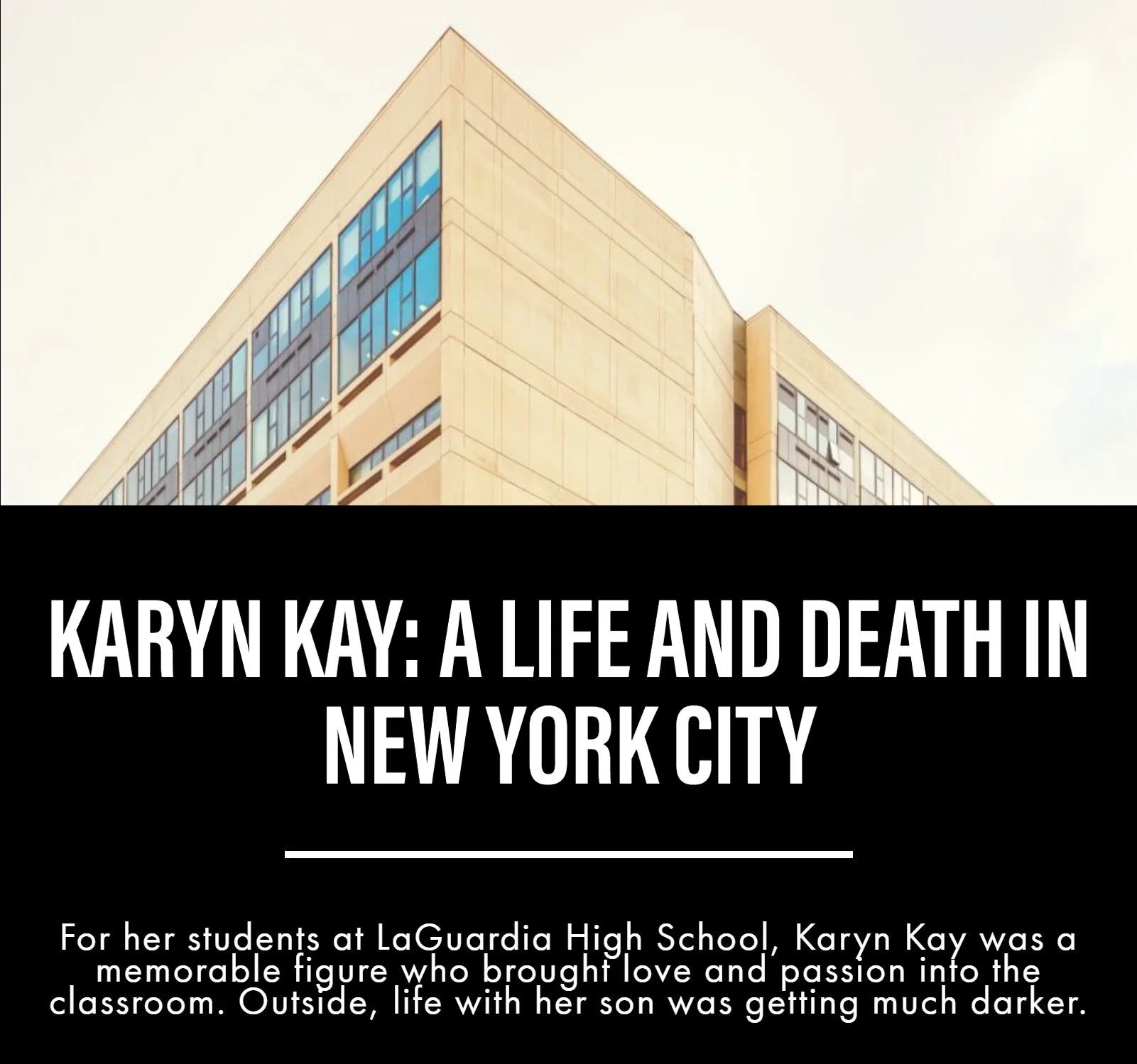 “On the morning of Tuesday, April 10, 2012, 63-year-old single mother Karyn Kay called 9-1-1. Her 19-year-old son, Henry Wachtel, was having a grand mal seizure. Neighbors later told police they heard sounds of struggle, Henry screaming “I’m sorry mommy!” over and over, then nothing. In the 1980s, after finding some success with her own writing (including three books about film, several episodes of America’s Most Wanted, and the screenplay for the 1988 thriller, Call Me,) Karyn Kay discovered her calling as Creative Writing teacher at New York City’s public performing arts high school, LaGuardia. A kooky, dark-lipsticked sprite of a woman, Ms. Kay danced, laughed loudly, freely dispensed hugs and “snaps” for spirited poetry readings—the kind of teacher that made countless students feel like they were her favorite, me included.”